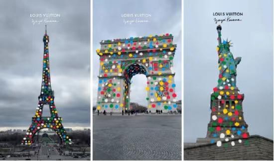 据新浪VR报道,近日,Louis Vuitton与Snap合作,利用其AR技术在埃菲尔铁塔、自由女神像、伦敦塔桥、凯旋门、自然历史博物馆和伦敦国家美术馆等地标建筑物上涂上了Yayoi Kusama标志性的彩色圆点。