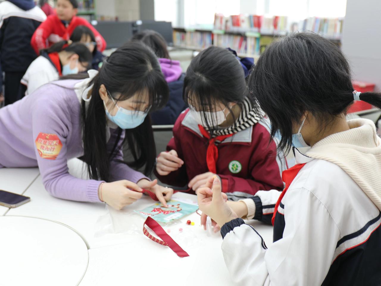 非遗编织传承课的老师们,带领学生体验着中国结的做法;