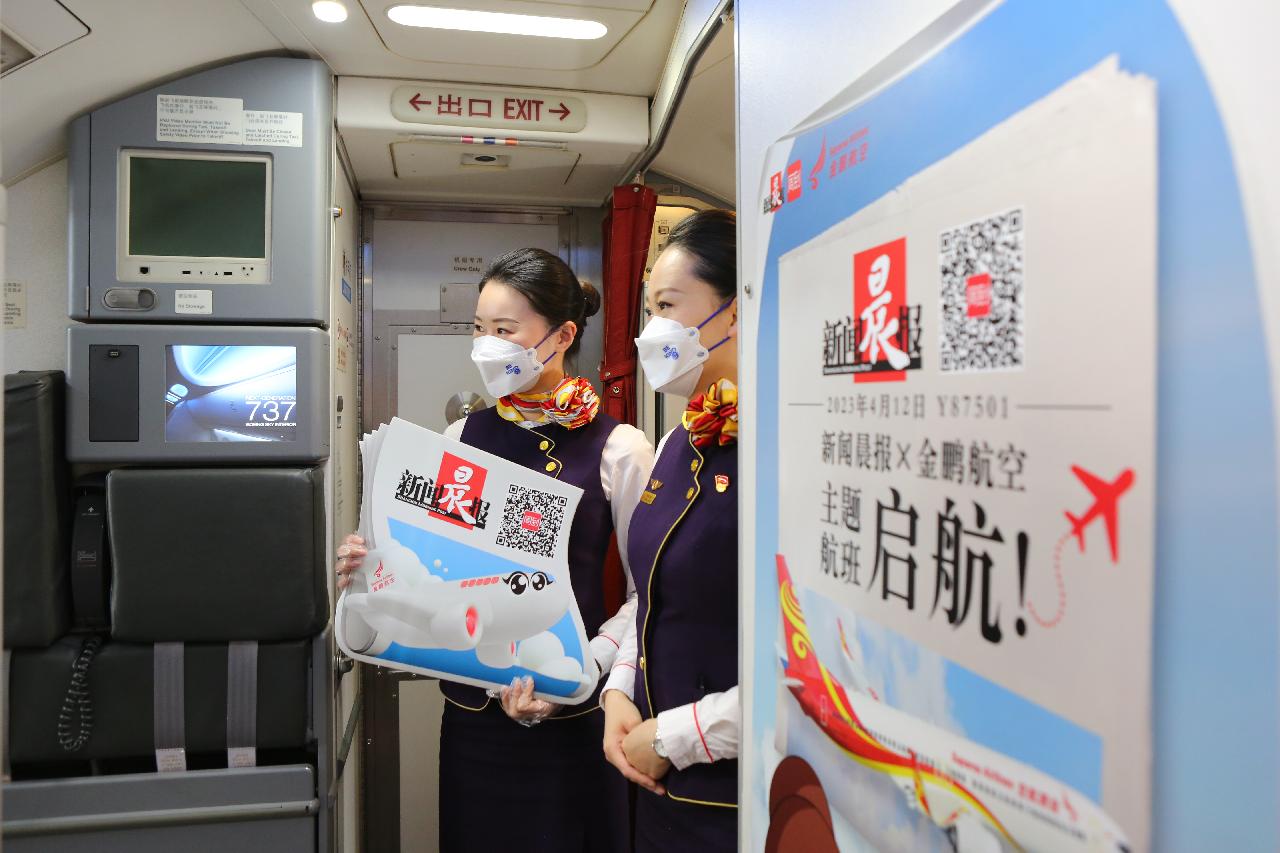 借着4月世界读书日即将到来的契机,金鹏航空将在接下来上海浦东出发的航班上把新闻晨报作为机上唯一配送的阅读媒体,为乘客和读者在万米高空送来“阅读的力量”。在主题航班启航活动上,机舱布置氛围浓厚、旅客争相互动答题赢奖,更有机长惊喜分享了自己和媒体、航空的两段缘分,彩蛋连连。