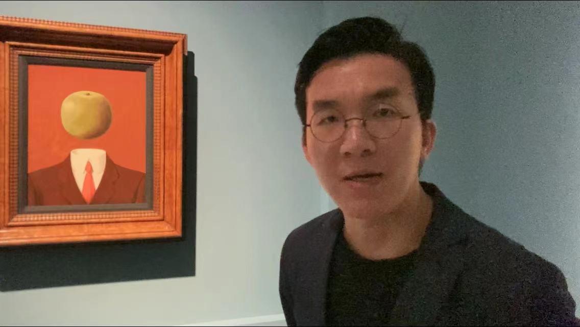 徐旭峰讲解道,马格利特的艺术风格影响了达利等一批超现实主义画家,他的作品符号有苹果、烟斗、风衣、帽子等,他打破了人们对常规物体的认知。比如这件作品里的苹果,给人一种惊叹号的感觉。苹果对于中国人来说,有着平平安安的吉祥寓意,而马格利特打破了常规,突破了人们对一件物品固有的认知,这就是马格利特带给我的刺激。