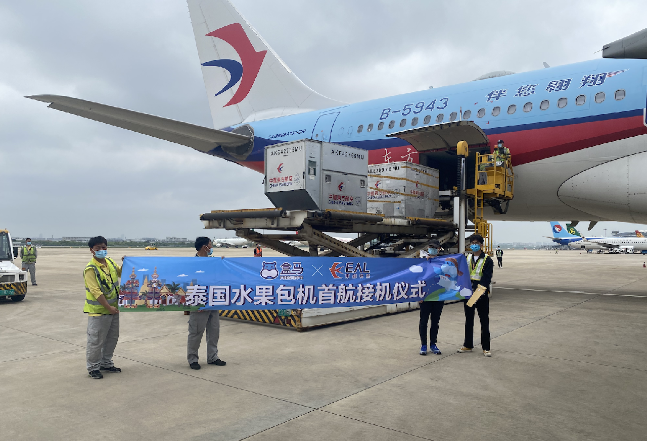 4月21日,一架搭载着龙宫果、彩虹芒果、南多美芒果、小众榴莲、山竹等18吨泰国新鲜水果的航班降落在宁波栎社国际机场,这是盒马与东航物流合作的泰国水果包机,把泰国田头采摘的新鲜水果飞速运到国内。