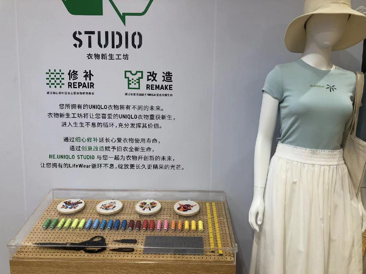 这座衣物新生工坊在旗舰店5楼,只见工坊里,缝纫机、刺绣机等一应俱全。“像这件白色T恤有一根线被勾掉了,于是就出现了一个小破洞,我们可以在缝纫机上帮客人补一下;如果客人喜欢,我们可以在这里绣一个图案,有蝴蝶、爱心等各种图案。”工作人员介绍,在日常工作中也会碰到一些顾客提出来,说衣服破了小洞,扔掉可惜,又不知道哪里可以修补,今天世界地球日推出中国首个RE.UNIQLO衣物新生工坊,为顾客修补及改造服务,也是希望可以延长衣服的使用使用,大家一起,共同节约资源。