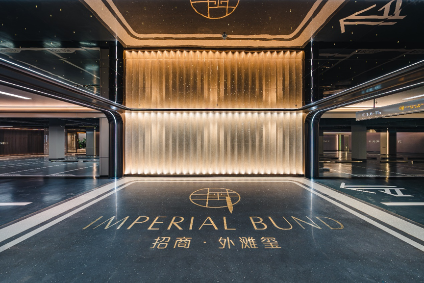 沿坡道来到地库玄关,此处的景墙采用折线石材,为体现灯光投射后细节展示的特点,招商蛇口上海公司在反复设计之后,又经细致严谨的工艺拼接出艺术肌理,使得归家视觉上呈现温润通透的美感。在选材用料上,地库玄关吊顶材质选用古铜色镜面不锈钢,搭配星空顶设计,车库的地面采用自流平地坪+聚氨酯超耐磨罩面,处处彰显细致用心和品质追求。