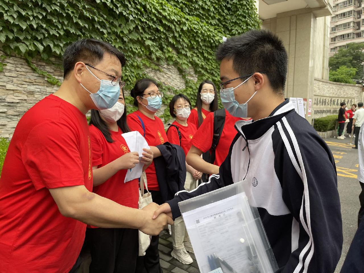 “祝你成功”、"沉着应战,不要紧张“、”你身经百战,没问题的!”“来,和语文老师握个手”“吃块状元糕,祝你高中”……大同中学的送考老师身穿“全力以赴、金榜题名”红色定制T恤为考生送考。“今天高三年级的所有班主任和语文老师都来送考了。”大同中学的语文宋老师说,从教24年的他已经送了六、七届考生参加高考。“我现在看学生就像看我的孩子们一样,希望孩子们都能顺利发挥,拔得头筹。”
