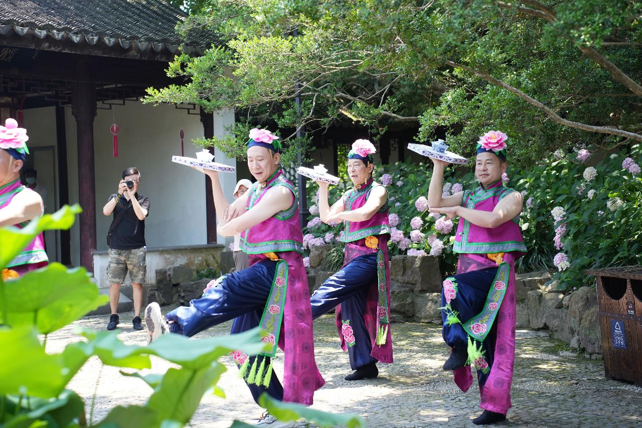 畅游不系舟、逸野堂、南厅、微音阁等亭台楼阁内,游客可沉浸式感受传统艺术与现代文化碰撞的激情,与洞箫、古琴、江南丝竹、徐行武术等非遗项目撞个满怀,还可体验观赏苏绣、花茶、马陆蔑竹、顾家纸绣等富有江南特色的非遗项目。