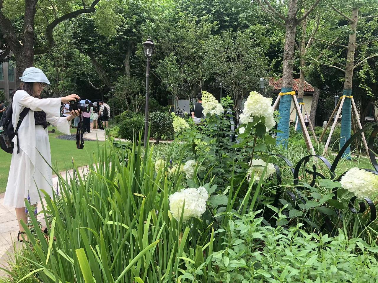 盛夏漫步绿地,还有两个品种的绣球在开放。绿地中央是一片草坪,蓝天白云之下,显得分外翠绿。绿地里,有一石桌,一看,桌面是一副象棋盘,带上棋子,坐下来就可以下一局。