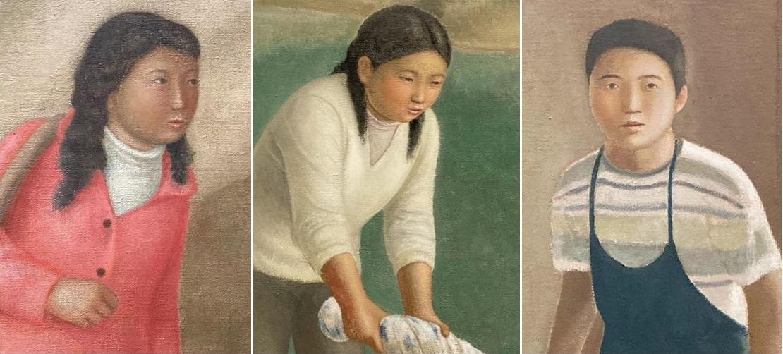 策展人杨紫还给出了一个观赏段建伟作品的视角:人物的失神。在作品《洗衣2》中,两名少女在湖边协力拧着浣洗的衣物,面部朝向观众的一位少女眼神朝向拧紧的衣物,却最终没有停落在衣物上,嘴角浮出一丝浅浅的笑容,显然,她的思绪已游曳到了远方。