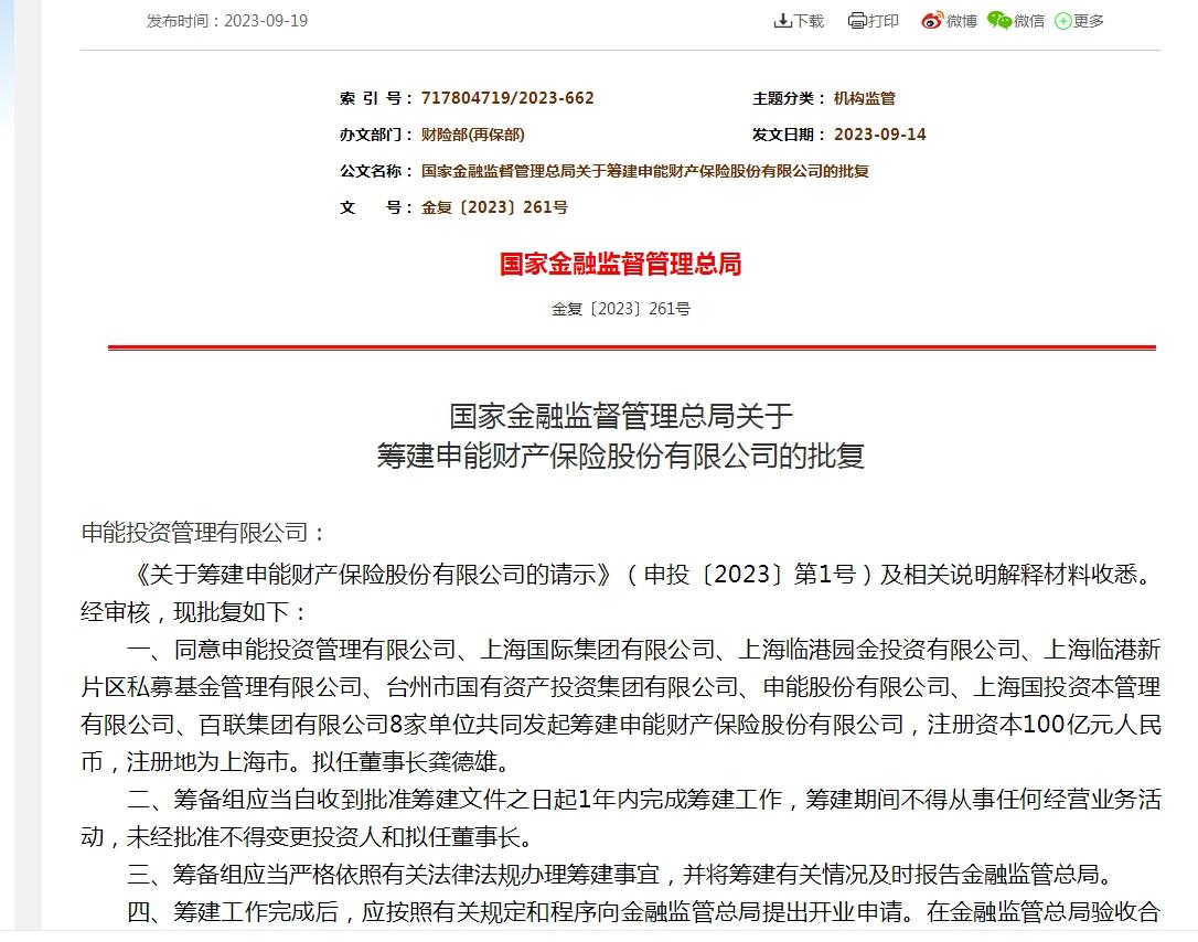 9月20日,国家金融监督管理总局网站近日发布批复,同意申能投资管理有限公司、上海国际集团有限公司等8家单位共同发起筹建申能财产保险股份有限公司(下称“申能财险”),注册资本100亿元,注册地为上海市,拟任董事长为龚德雄。