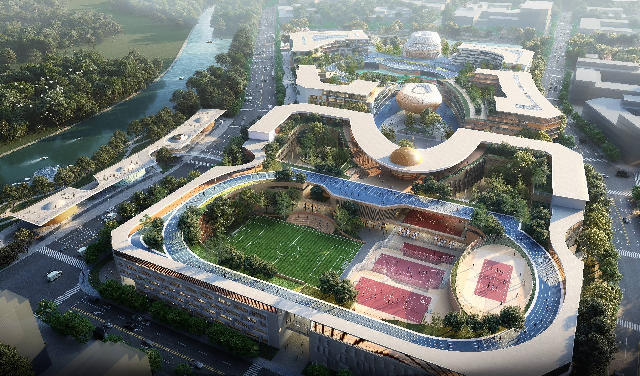 整个项目的设计以开放融合的姿态面向城市环境,包括中部面向城市打开的星环广场;西侧与九四塘绿地自然渗透的景观空间;以及南部沿水岸平行展开的观景平台等。