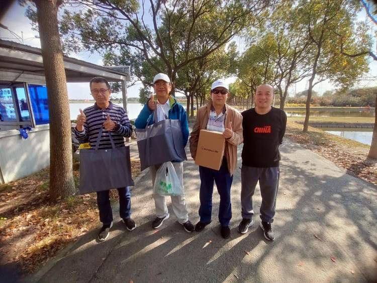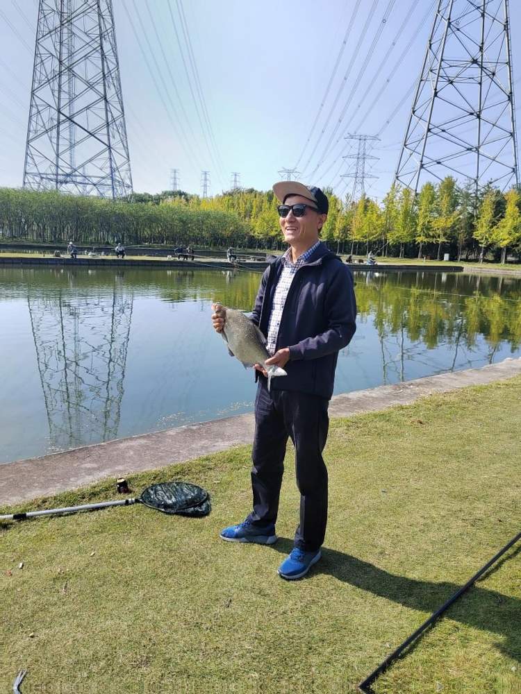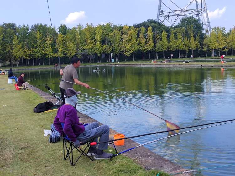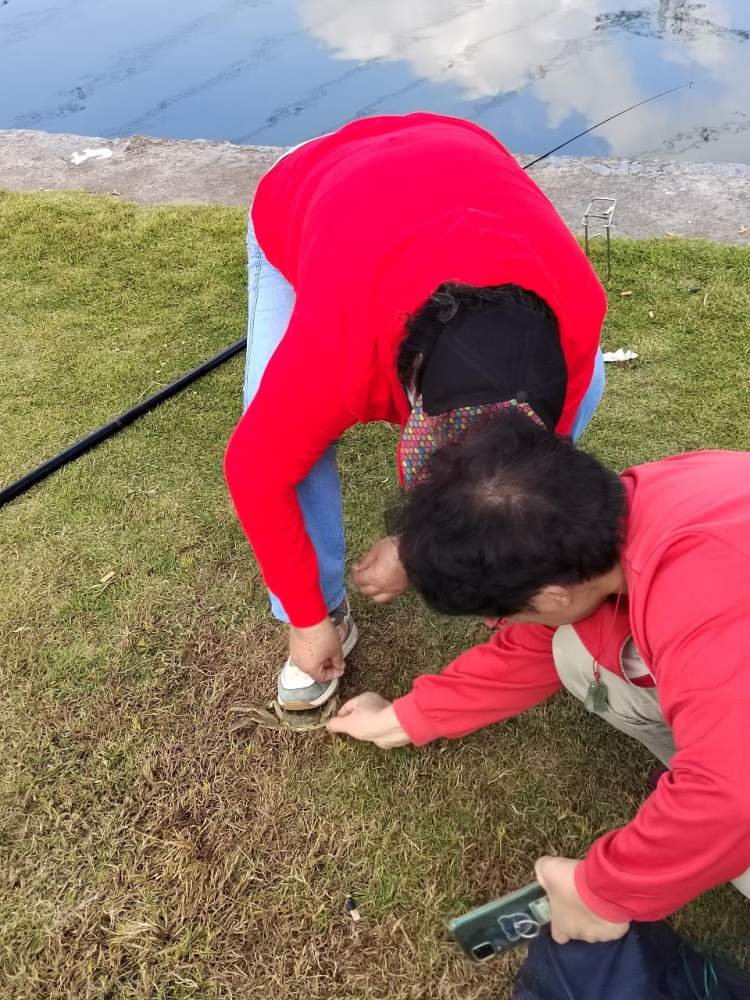 吃饭了,退管所的老师让大家先去吃饭,可不少人坚持在河塘边看着渔竿野餐。我等‘’白板‘’就到餐厅用了午餐。饭后几位高产者开始最后的冲刺,我已没了信心,笑称躺平算了。一点半,比赛结束,有收获的拎着战利品去称重,我也去凑热闹。只见一小车上装了好多好多河鲫鱼,全是老高钓得,天!冠军啊!老高热情招呼我,拿几条回去,好一个豪爽,他帮我装了三条冠军鱼,也让边上‘’白板‘’拿鱼,结果他一共钓了42斤鱼,全让我们共享了,自己只拎了四条小鱼,真让人感动。丁丁也把钓得白水鱼送给了一无所获的老同事,让人人满载而归,真正是友谊第一,比赛第二,老友情深,一个难忘的重阳节,收获满满!