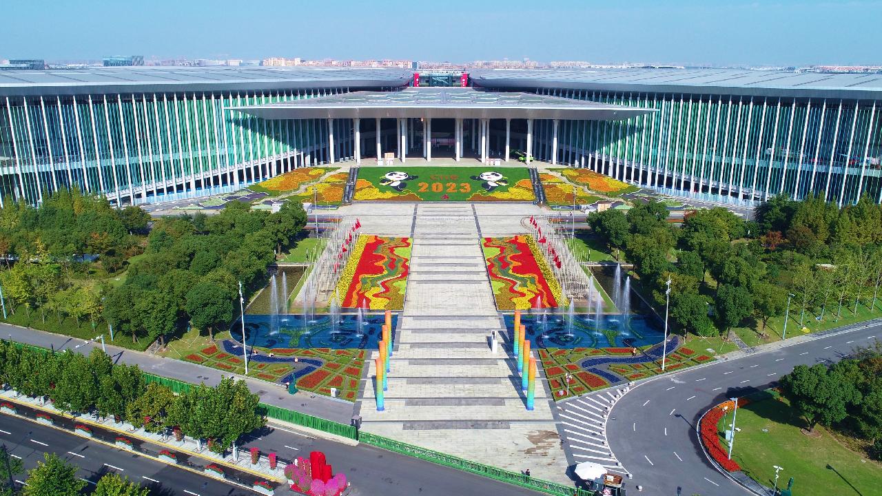 角堇、百日草、孔雀草、一串红、向日葵以及各种水生植物盛开;入夜,8根景观柱再次换新点亮,通透灵动……第六届中国国际进口博览会场馆景观装饰全面定妆,国家会展中心再度美轮美奂。本届进博会景观装饰效果延续前几届风格,以“海纳百川、共享未来”为主题,主要在场馆的南广场以及西厅展开。