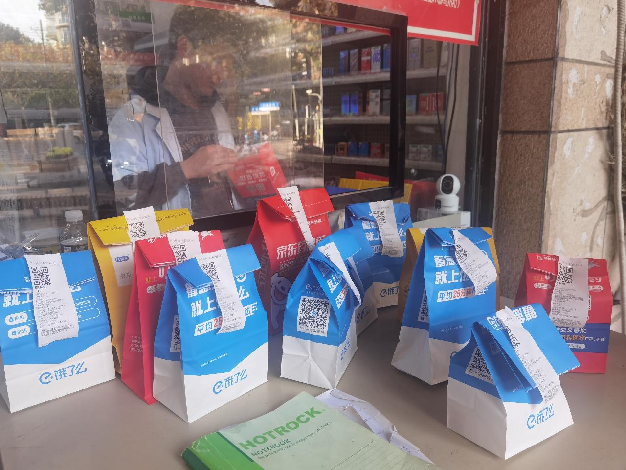 在昌平路一家支持医保的叮当快药,记者看到外卖窗口,药师正不断将市民订购的药品装袋,放到窗外的外卖台上,桌子上已列了一堆等待配送的药品,骑手小哥不时来取。