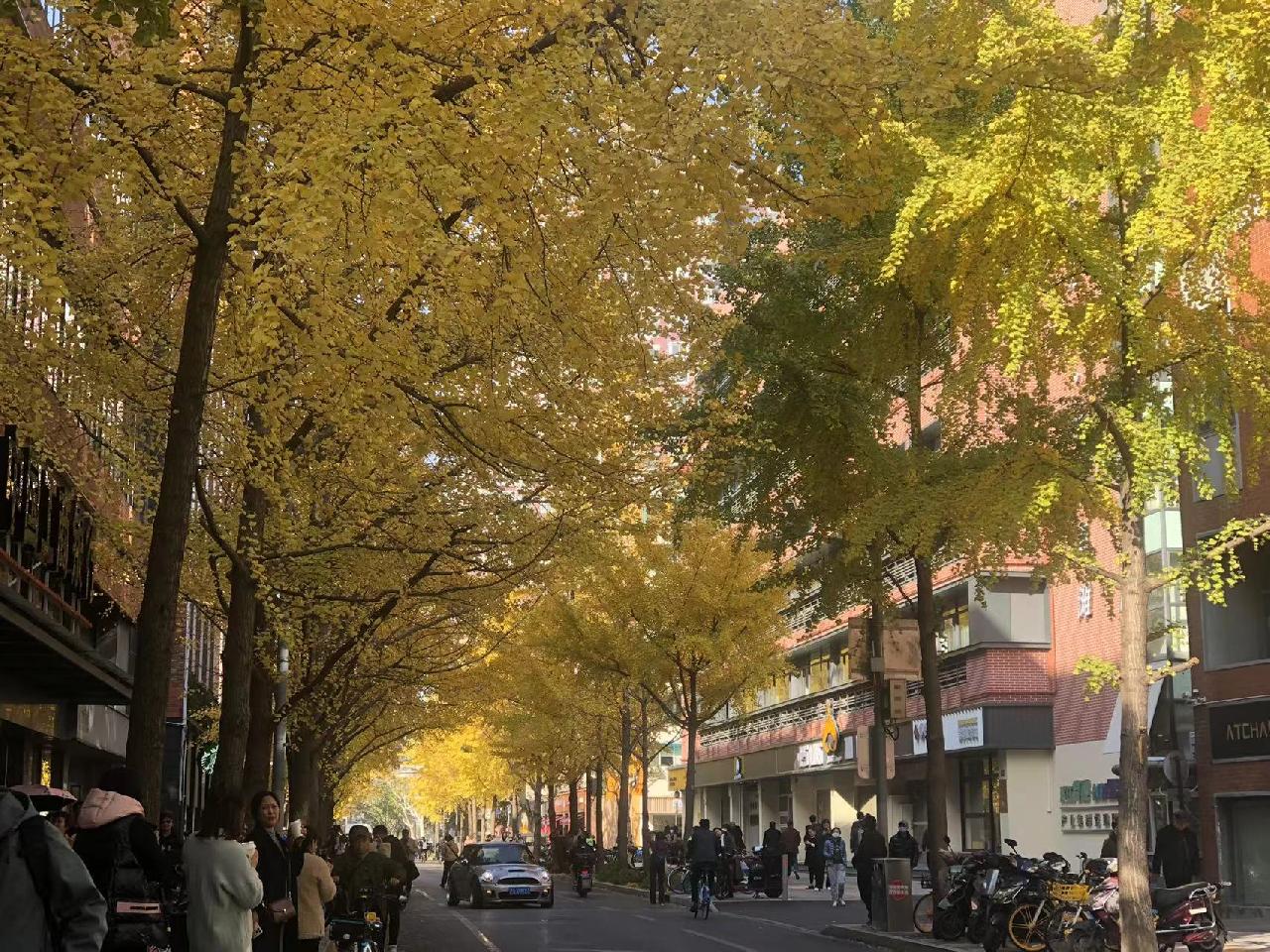 因为两侧的银杏长势好,黄得透亮透亮,五里桥路到汝南街这一段的拍摄者更为集中,特别是五里桥路口一幢有彩绘墙面的居民楼,以及上海师范专科学校附属小学附近,更是最热门取景地。