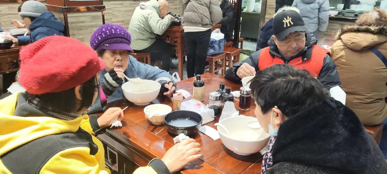 段老伯买了不同口味:“颜色上白里透黑就是黑洋酥汤团,白里透红就是鲜肉汤团。”他还和同桌的食客聊了起来:“侬觉得哪种好吃?”那位阿姨说:“我更喜欢鲜肉的,咬开来有一包汤汁。四新的汤圆大,陕西北路的美心我也去过,个头比它小,各有特色吧。”