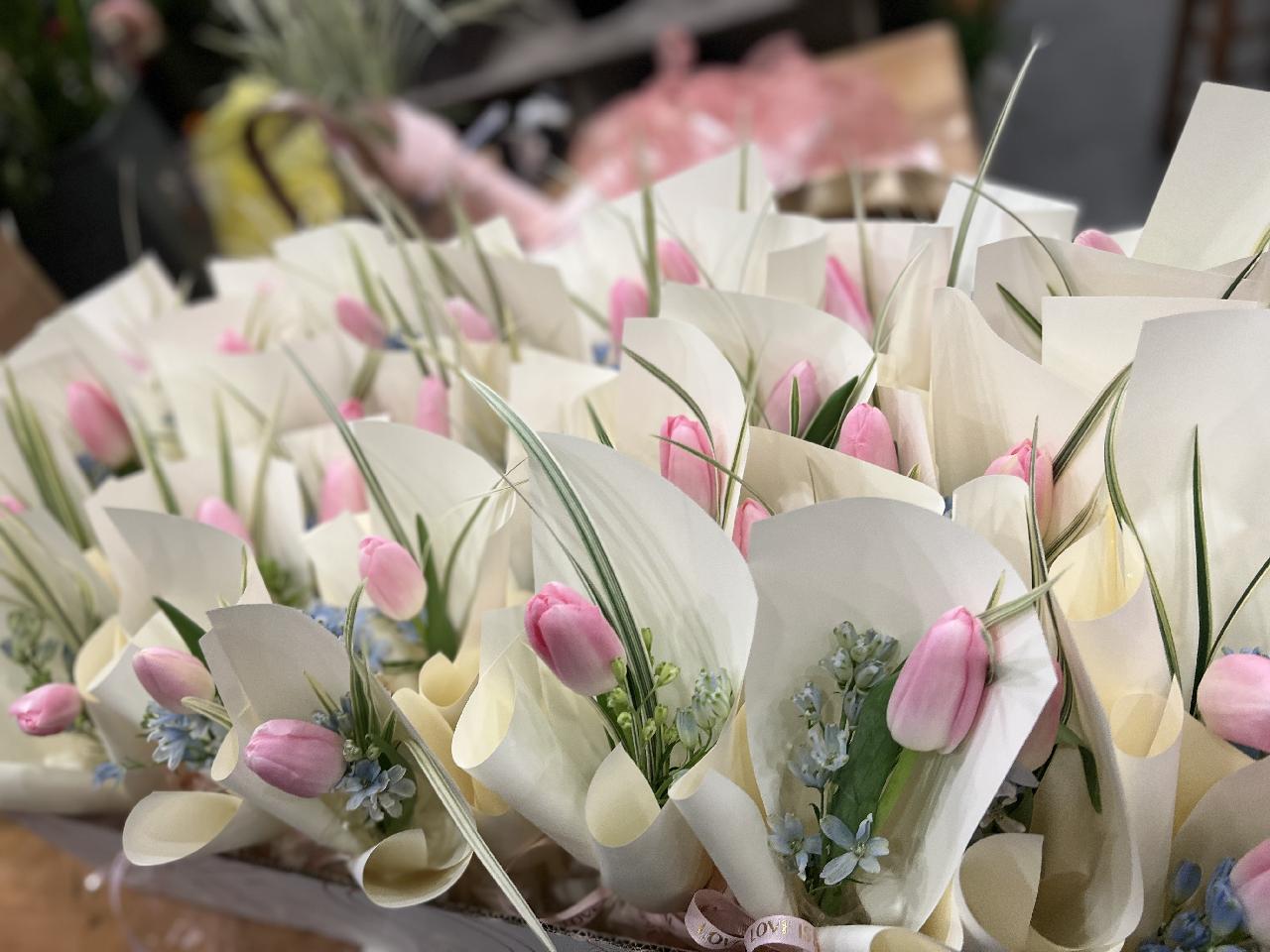 虹桥花市珍馨花艺的老板娘沈芸同样表示,今年,价格实惠的单支花以及小型花束更有市场,过去小贵的大花束、花篮订单骤减,“这几天恨不得三头六臂,单支郁金香、单支红玫瑰,总共包了五六百支吧,很考验体力。”