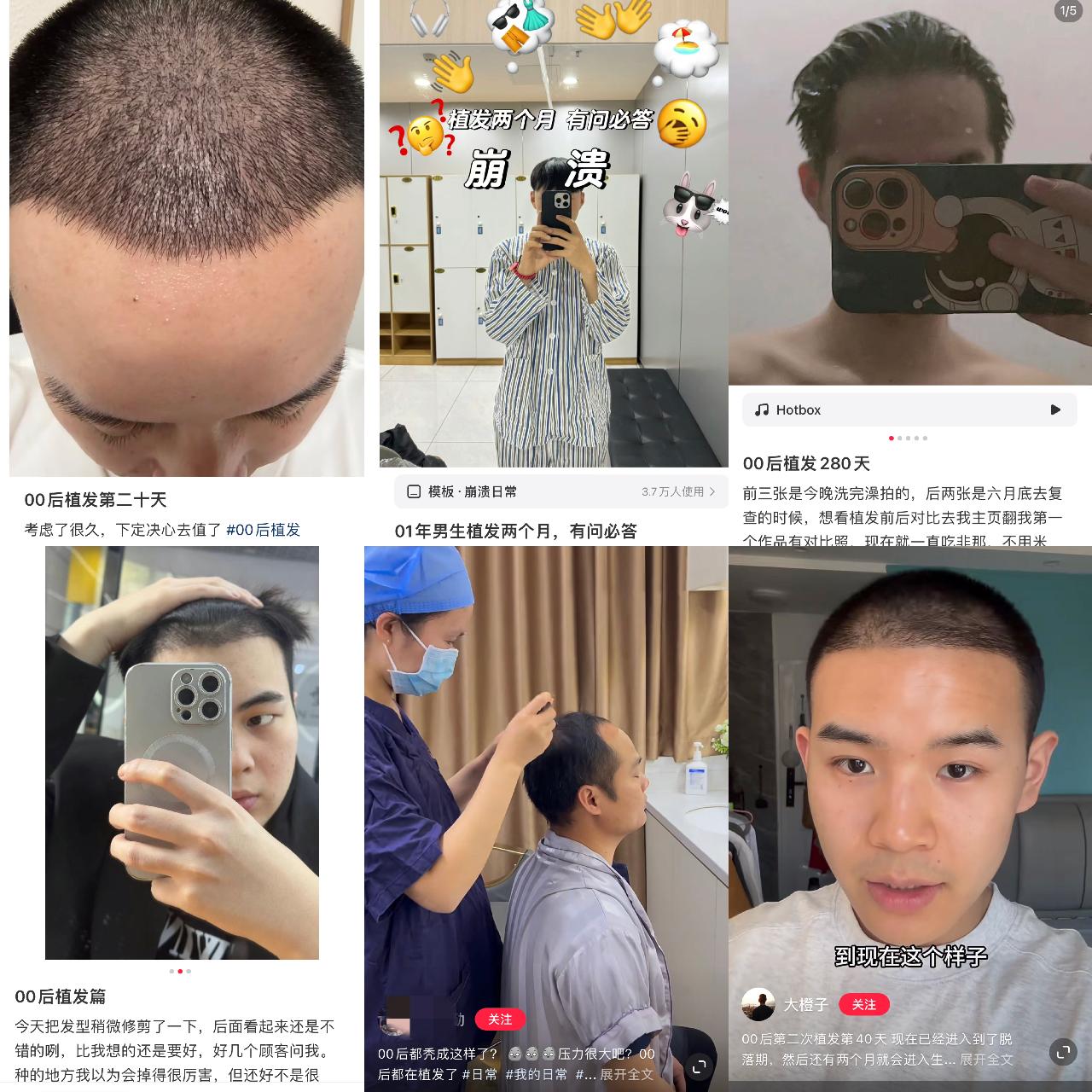 在小红书等社交平台上,这类视频并不少见。00后们纷纷晒出了自己日益稀疏的后脑勺和后退的发际线,大家彼此鼓励打气一起接受植发。他们自我调侃:“00后整顿职场?不,他们整顿的是自己的发际线!”