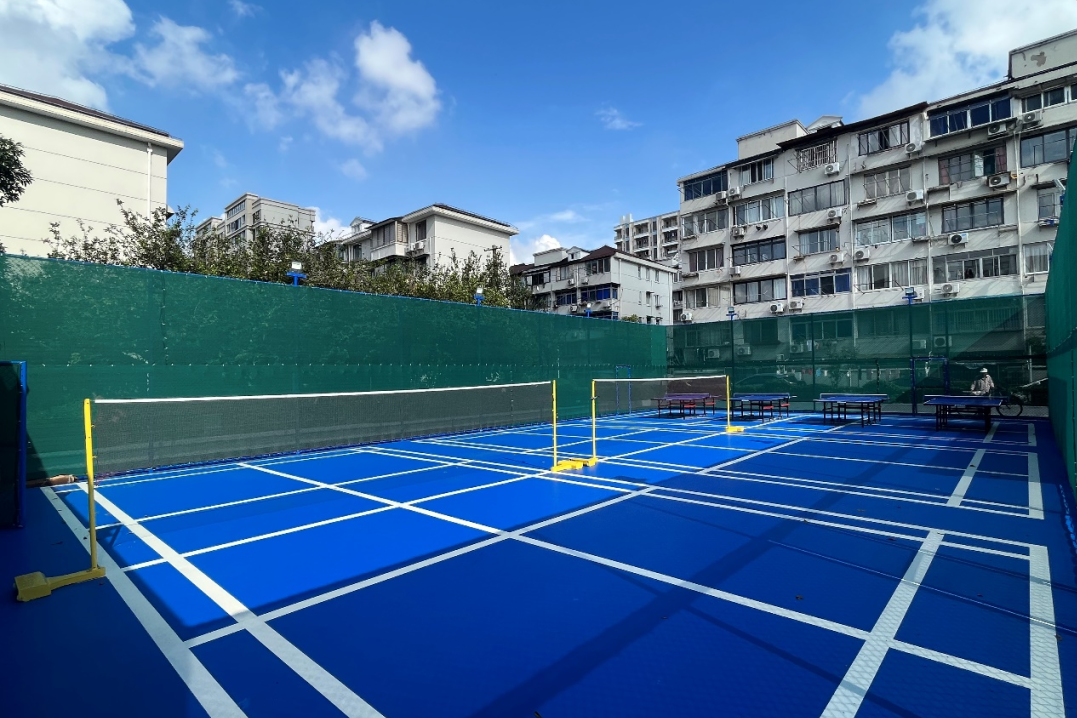 运动场内设有三片羽毛球场地和四张乒乓球桌,布局灵活,市民可根据需求自由调整。为提升场地的安全性,四周还增设了防风网。所有健身器材均可移动,收纳后,该场地还能转化为社区的小型活动空间。