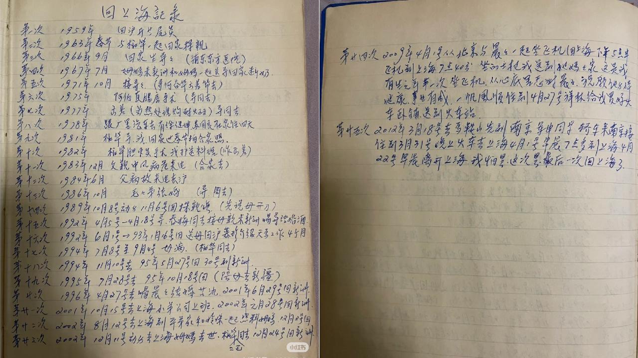 玲珍留下的这本笔记里,25次回上海的记录仅占了一页多纸张,但它几乎浓缩了一个人的50年。