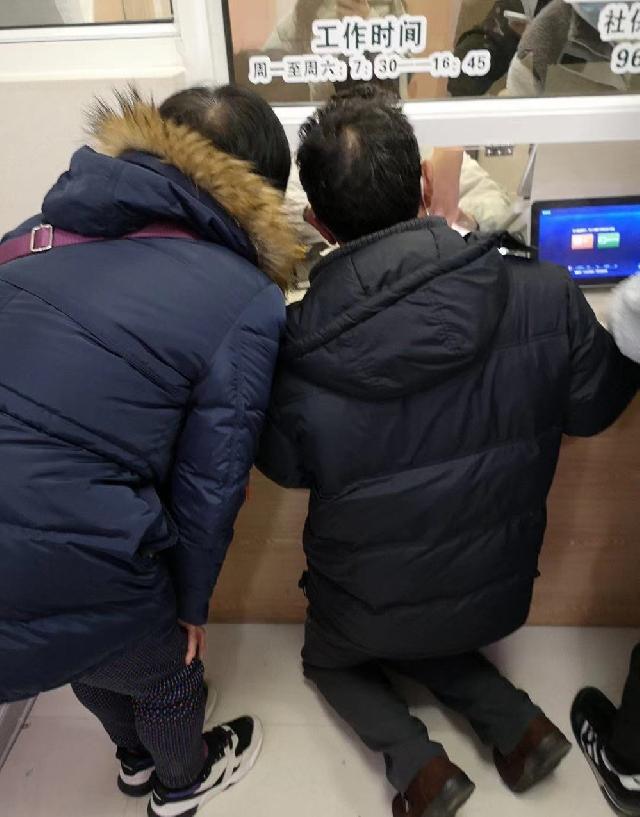 微博文字下方还配了一张两位患者在窗口办事的照片,左侧一位弯着腰,右侧一位双膝着地跪在地上。