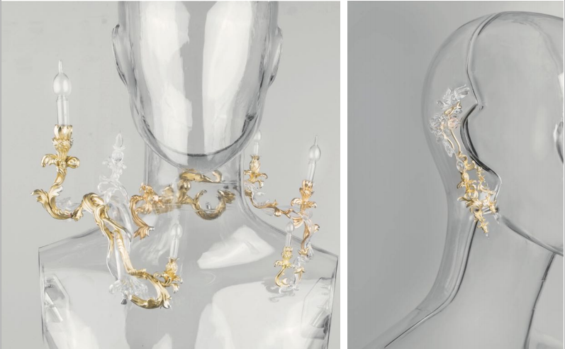 袁祎彬同学则将首饰与吊灯组合在一起,赋予首饰新功能,使首饰不止具有单纯的装饰的意义。Led 灯与金属材质的首饰结合,首饰呈现出融合了吊灯美的感官特征,宛若大幕拉开,一出别开生面的欢宴正在上演。