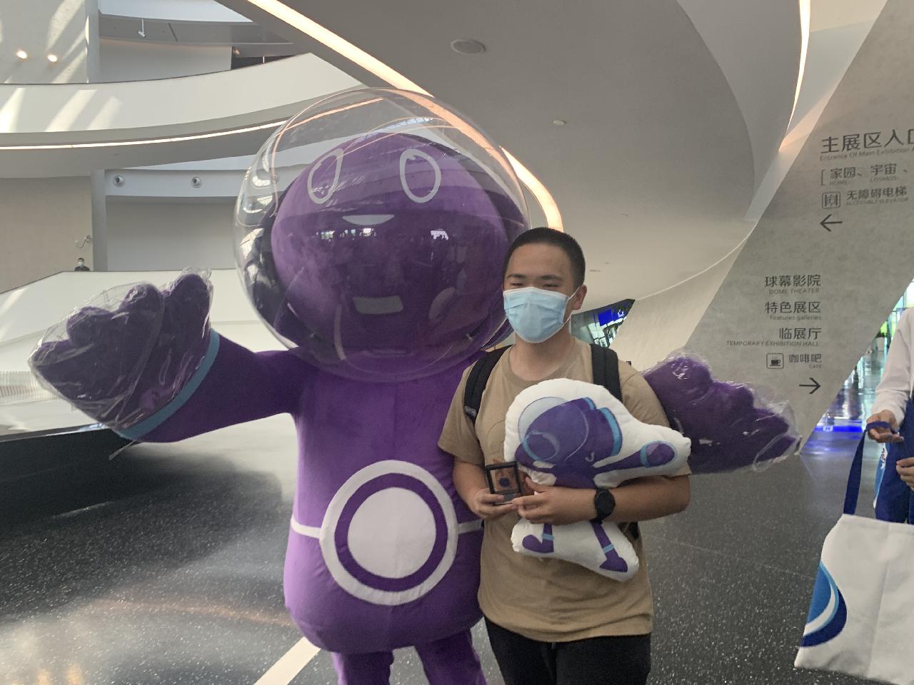 18日一早,天文馆的工作人员就早早开到馆里,准备迎接观众,对于第一位观众,吉祥物科飞热情地送上了拥抱,送上了精心准备的大礼包。
