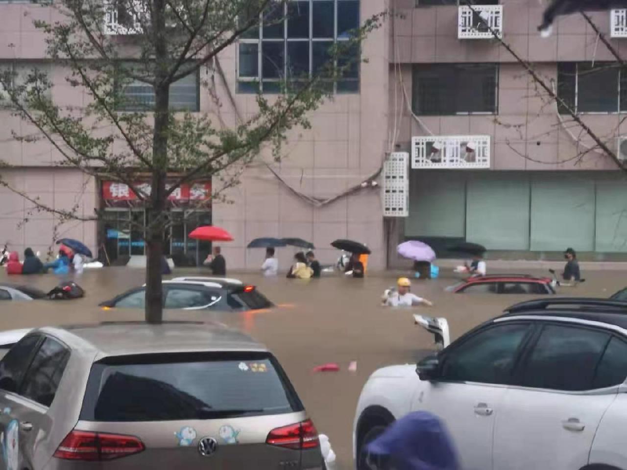 我们公司在六楼,也算是高层了。我也会透过窗户一直观察外面的情况。我看到的只有漫无边际的水,路中间的汽车都被冲走,现在因为泄洪水位降下了很多,虽然人已经安全撤离,但是一辆辆汽车还在原地打转。