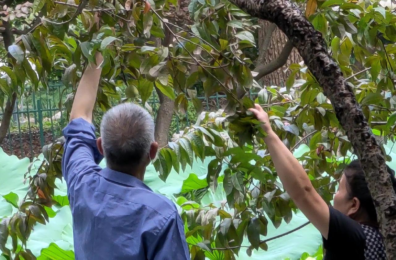 鲁迅公园甜爱湖畔,桃树结的桃子渐渐成熟,郁郁葱葱的叶子遮挡不住一个个小毛桃。这些看了就让人喜欢的果实真是十分诱人,但是个别市民偷摘果实的不文明行为也随之出现。