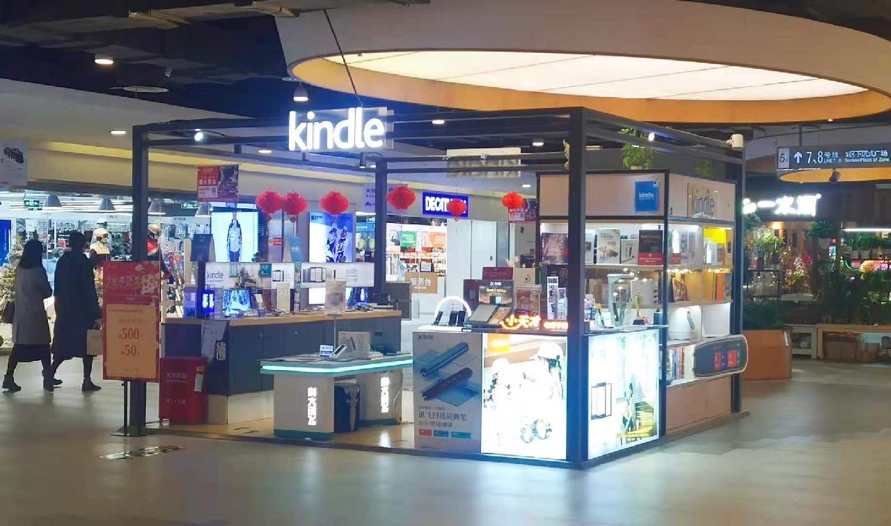 在位于世博源购物中心的亚马逊Kindle线下旗舰店,展示了Kindle青春版、经典版和尊享版三款产品,不时有顾客过来了解产品。