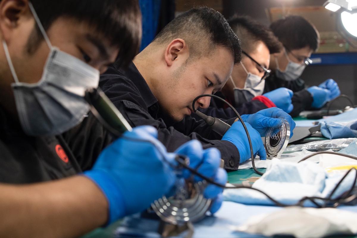喷砂之后,便进入了冬奥奖牌制作的另一道关键工序——研磨工序。这道工序采用了中国传统金工压亮的手艺。工匠在显微镜下用压刀在磨砂表面压下一条条光滑的亮线,祥云纹、冰雪纹和文字就这样压亮成功。“全手工压亮,制作一块奖牌要耗时6-8小时。但手工的温度会让金牌的色泽显得更柔更典雅,不像机械抛光那么生硬。”
