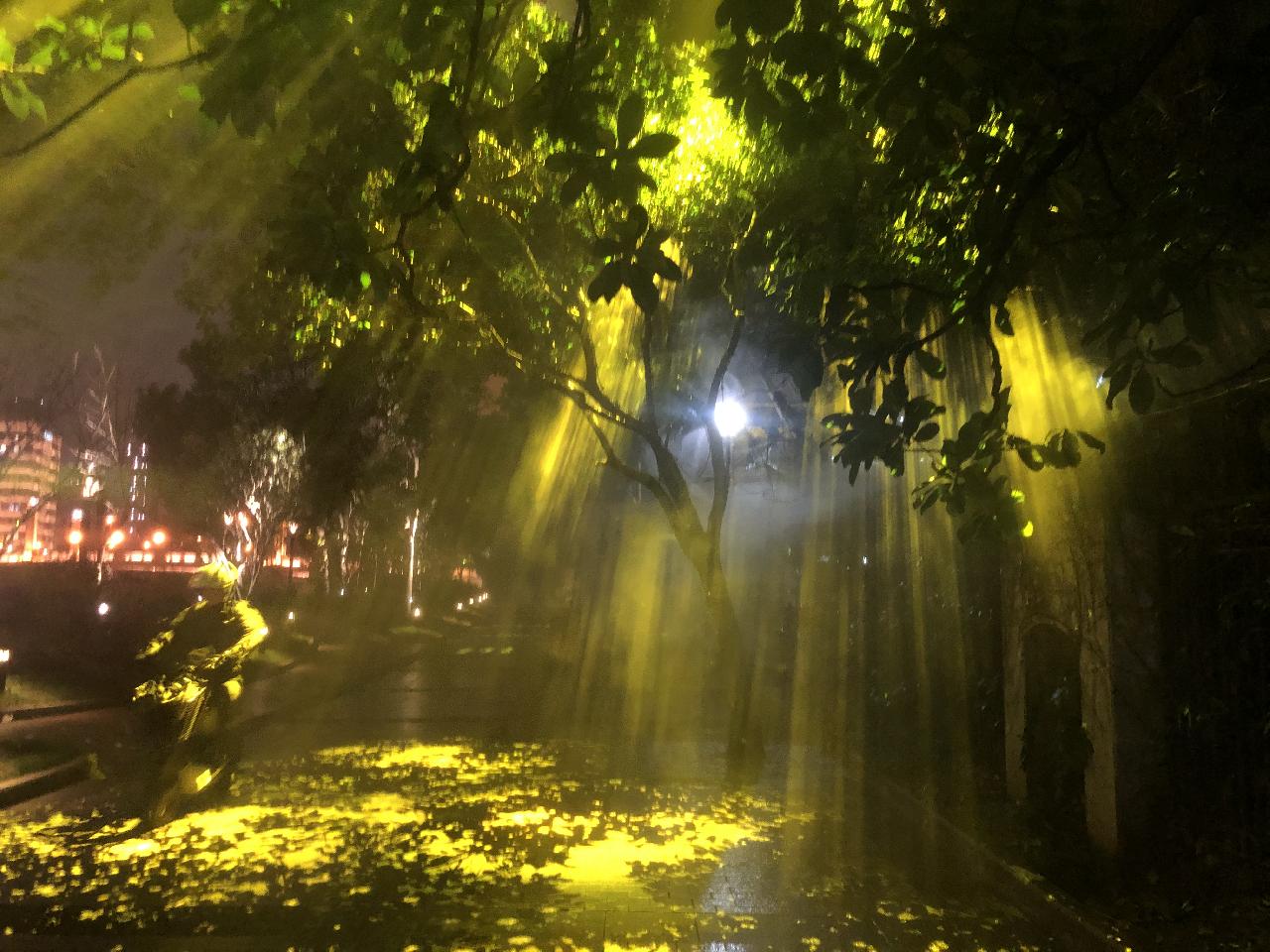 走到乍浦路桥的樱花谷是第八个景点“影动外婆河”光影秀。来到这里,仿佛进入了一个浪漫的世界,地面上樱花花瓣在飞舞,空中,泡泡机吹出的泡泡飞扬,树上“蝴蝶”一闪一闪。光陆大楼顶部,光束灯模拟皓月当空,静谧的月光穿过紫藤形成月光下斑驳的影。