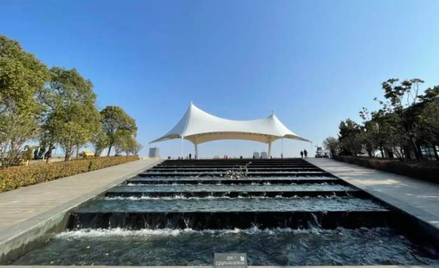 栈桥下设名为“叠水灵动”的阶梯,共分11个层级,高低落差近3米,叠水喷涌时,晶莹剔透的水柱伴着潺潺水声,让人身心舒畅、畅快惬意。