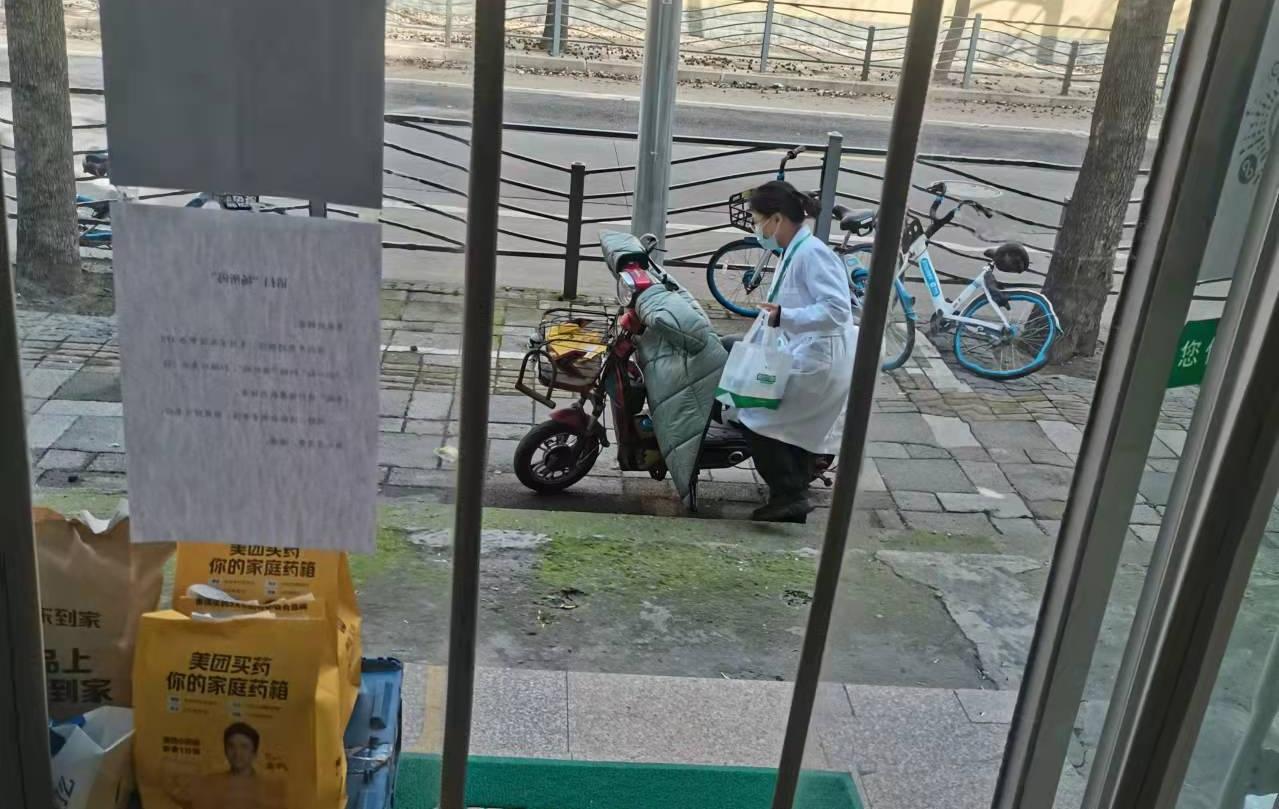 由于小区封控,药店工作人员只能将药送到门口,由居委、志愿者传递进去,由封控小区内的志愿者送药上门。