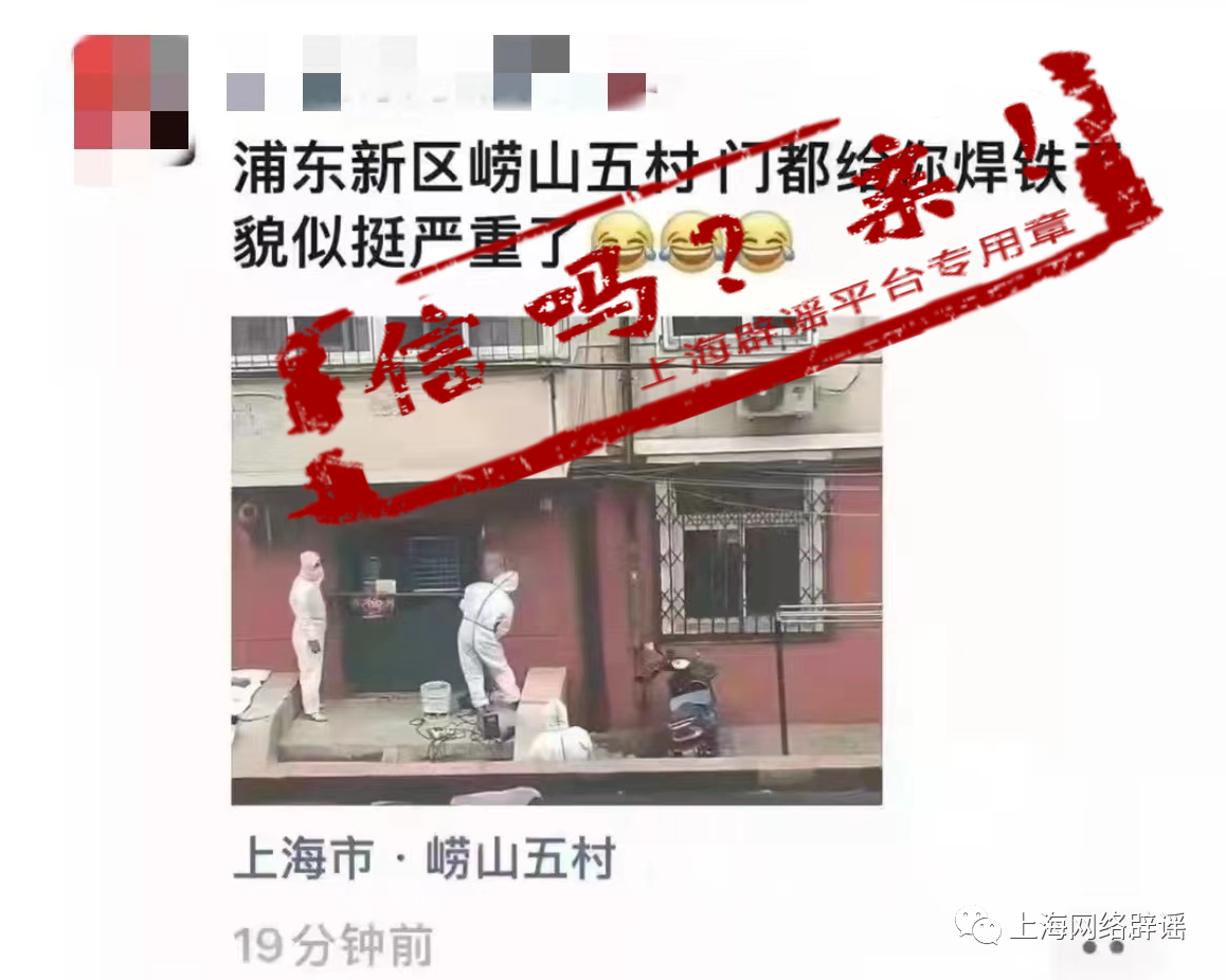 上海辟谣平台向崂山四村、五村所在的陆家嘴街道工作人员求证。对方表示,视频画面的单元楼栋并非崂山四村、五村。实际的单元门样式、墙体漆颜色与网传视频有显著差异。小区也不存在对单元楼进行焊门的情况。
