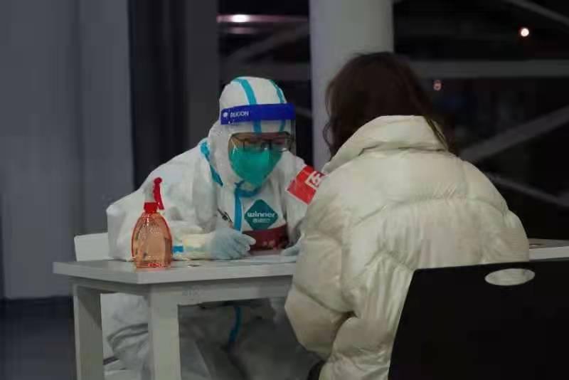 医疗队临时党总支副书记、治未病中心主任周扬穿好防护服,率先走进N1场馆,他特意将一枚党徽贴纸粘在了左胸口。戴着N95口罩和面屏,他拿起喇叭,站到了收治病人的最前线。