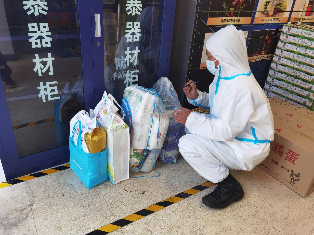 开出证明的当天,林先生从静安区芷江西路街道出发,经过二十分钟到达普陀区真如镇街道。此时,宝妈群的毛女士通过志愿者将纸尿裤送到了门口的快递架。又经过不到一刻钟,抵达终点的普陀区桃浦街道。宝宝就在这个小区,小区的志愿者们全副武装,前来取货。