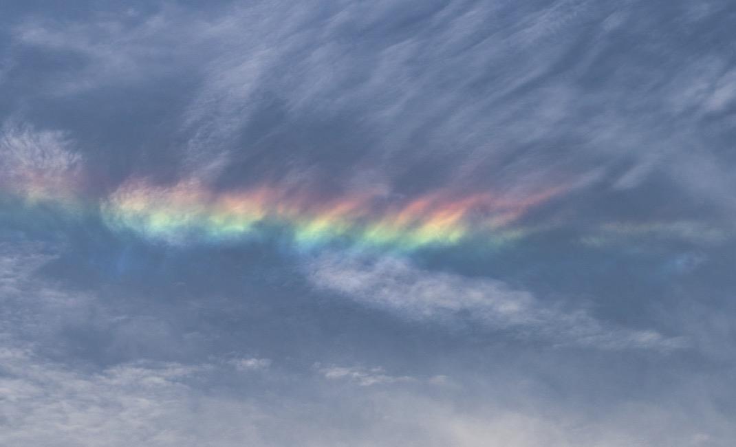 中午前后云系相对较少的时候,一些网友还拍到了“日晕”和“环地平弧”,日晕大家还比较熟悉,像火彩虹一样的环地平弧较为少见,是色彩最鲜艳最美丽的光晕。