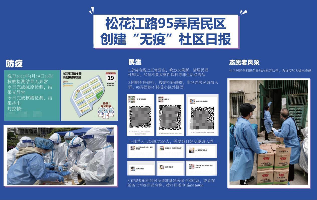 各居民区深入排摸、汇总分类居民诉求,将社区群众最关心的事项逐一列项,排出优先顺序,在此基础上纷纷打造符合小区特点、满足居民需求的动态信息公布机制。“足不出户”在家,居民最关心小区的阳性病例新增、分布情况、生活物资购买渠道、代配药及外出就医流程等信息。这些信息“硬通货”遂成为“防疫动态”的着力点和聚焦点。各居民区开动脑筋、各出奇招,通过楼组微信群发布咨询,请社区达人手绘疫情地图、制作防疫日报,及时准确将社区第一手动态信息传递给居民,让老百姓心中有数、心里有底、知己知彼,让真相跑赢“谣言”,进一步提升了社区群众同舟共济、战胜病毒的信心。