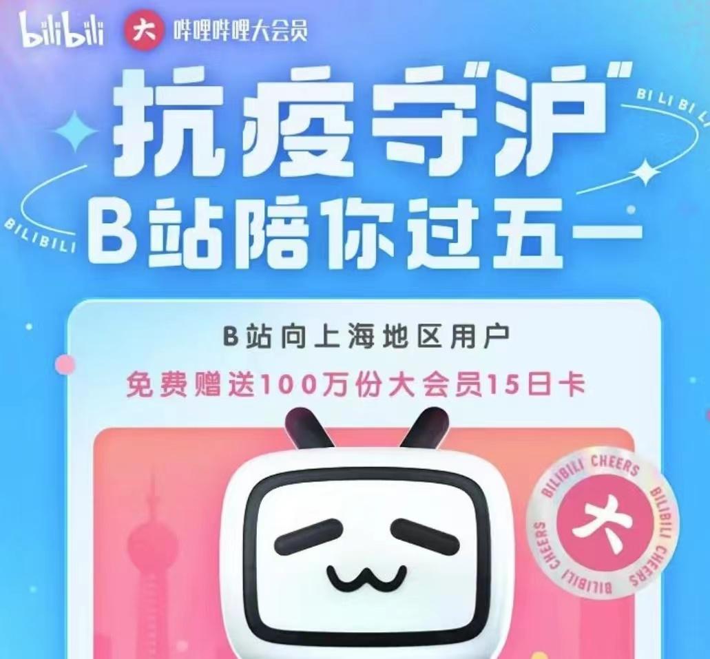 哔哩哔哩为上海市民免费赠送100万份大会员15日卡,4月29日13:00起可领取。