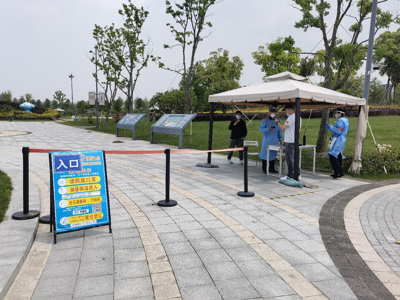 市民来到公园门口,先要出示48小时核酸报告,同时测温,然后扫描场所码,一切完成,无异常之后方可以进入公园。公园门口有志愿者、保安负责查验核酸报告,测温,引导扫描场所码。