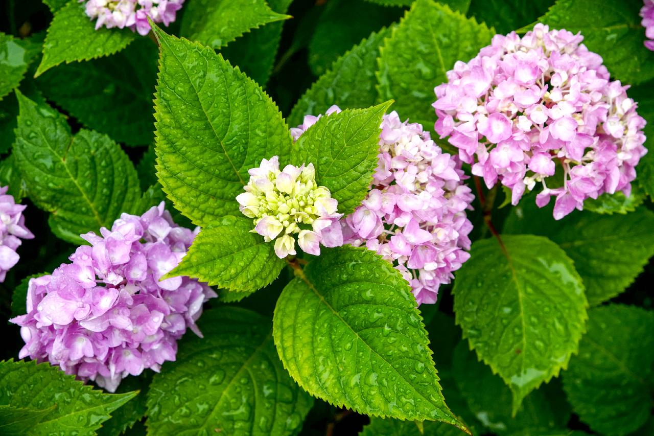 而雨中的绣球花枝繁叶茂,椭圆形的宽大叶子青翠舒展,每片叶子每个花球都托着新鲜的雨珠,色泽明艳动人。