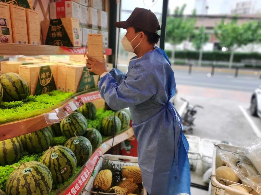 高仁是百果园集团上海区营销部的员工。4月伊始,作为中共党员的他便主动申请下沉到保供一线,当起了新华路街道淮海西路门店的临时店长,为附近居民做好食品瓜果保供。