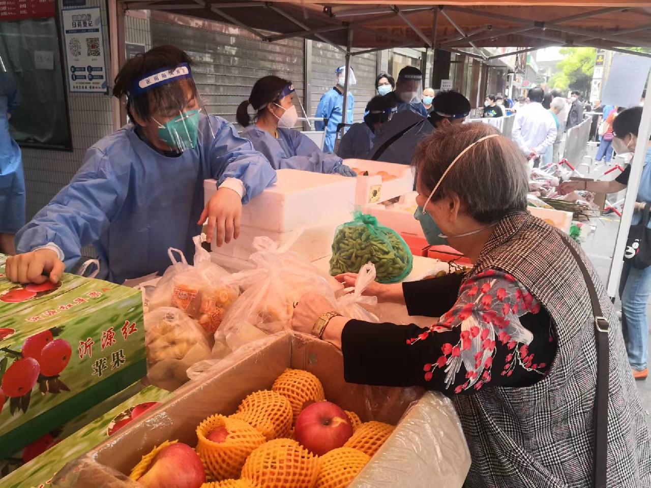 快来排队,今早江南菜场开门营业啦!”“双汇猪肉套餐4斤只卖78元”“侬看看,米线、空心菜、牛心菜、丝瓜,5斤左右卖19块,还送香葱呢”……
