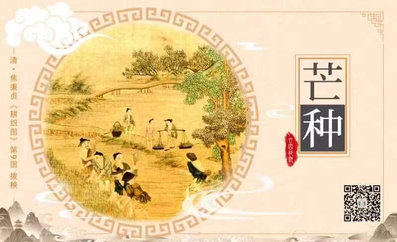 在这幅芒种“拔秧”的画中,五位农民正赤脚在秧田里忙着拔秧苗,田埂边三位农民将秧苗放入竹筐里,大树下还有一位腰插蒲扇的农民在休憩。