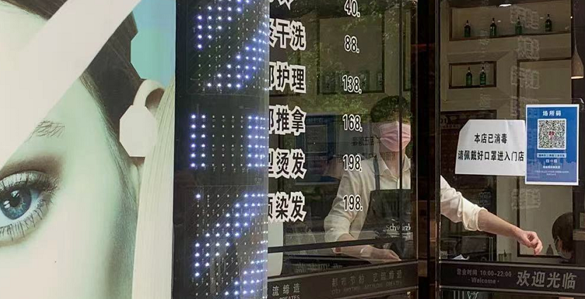静安区平型关路街边一家连锁理发店目前已经恢复营业,店门口张贴着一张“场所码”。门口的工作人员表示,所有进店客人必须先扫场所码,然后显示有72小时内核酸阴性证明才能进入。
