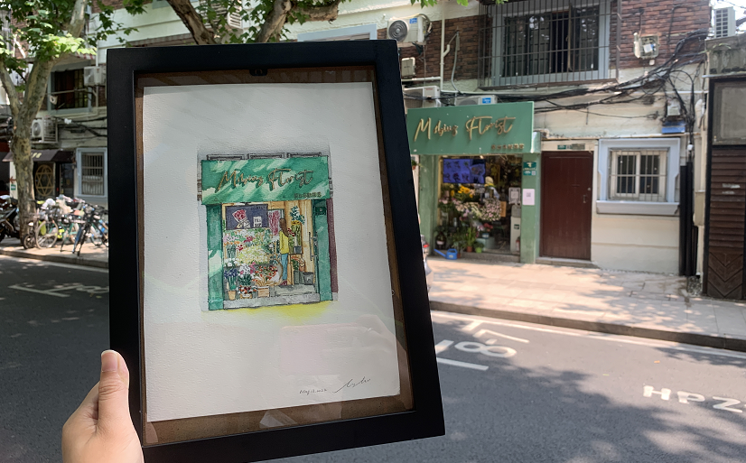 6月17日中午,艳阳高照,两位小姐姐在南昌路上的莫比乌斯花店门前合影。特别的是,她们一同捧着一幅装进相框的插画,画上正是背后花店的外观。