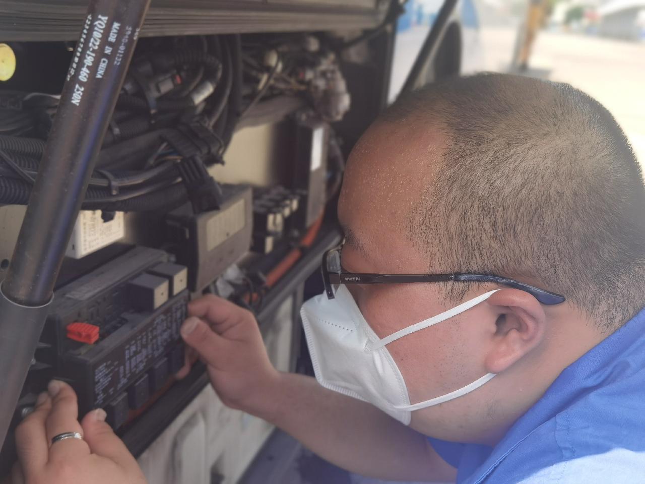 中午,车间内的温度有35℃左右。这时,结束了早高峰班次的公交车辆陆续返回场内,修理车间也迎来了报修高峰。“师傅,车子的空调不制冷了,请帮忙看看。”驾驶员说道。王师傅接到驾驶员的报修后,立刻放下水杯赶去检修,初步判定是车顶的冷凝风扇不转了。于是,王师傅熟练的穿上高空作业防护绳,带上工具,爬上了车顶进行维修。