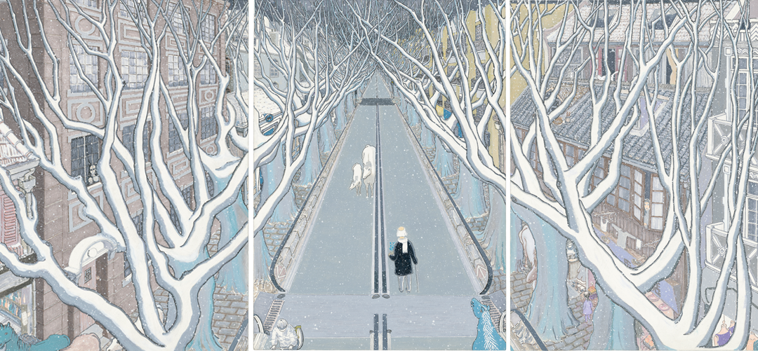 金宇澄的绘画创作始于2012年长篇小说《繁花》的插画,之后他再也没有停下画笔。他在自述中说,“写完《繁花》后发现还可以画画,有时候画到半夜三点。画一幅画非常愉悦人。”而他画中的内容,是上海熟悉的楼宇街道,充满着天马行空的想象力。