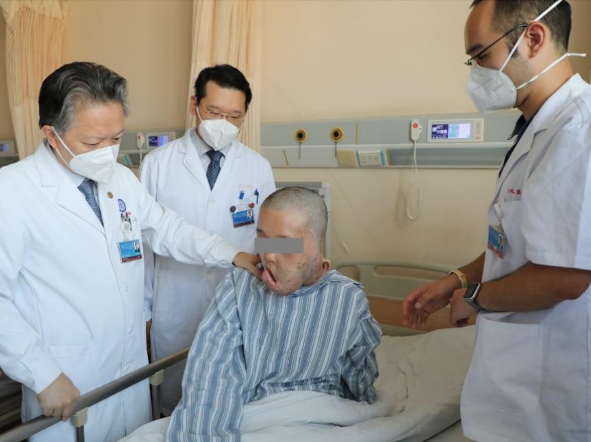 手术当天,李青峰、张陈平、张文川三位教授团队同台手术。张陈平教授、杨溪医生对肿瘤周围结构进行了精细解剖,分离肿瘤与面部肌肉、血管、神经,以及受损的上下颌骨,最终将面部巨大的恶变肿瘤完全切除;李青峰教授和王智超医生根据患者的缺损部位和周围组织的残余情况,针对性地利用周围组织为患者设计了面部重建路线,促进患者术后的容貌改善和修复,最大程度的降低了患者的创伤。