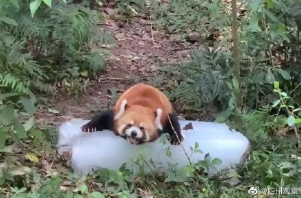 无独有偶,在河南洛阳栾川一野生动物园,一只小熊猫因天热趴冰块降暑,萌翻一众网友。