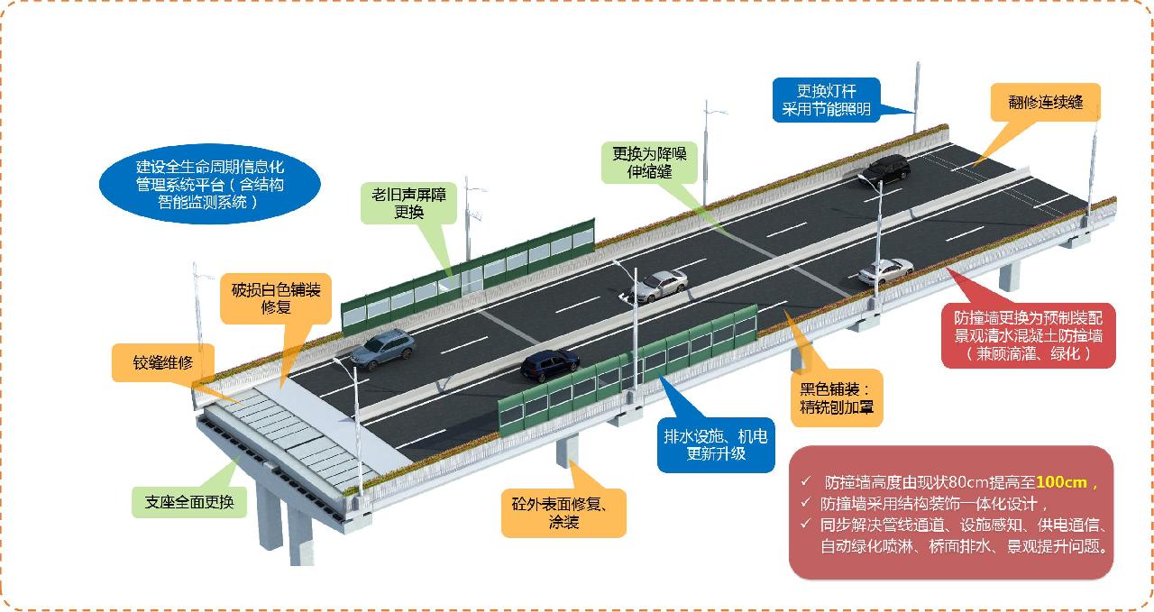 改造计划包括四大块:桥梁结构功能完善提升,对存在病害的高架主体结构进行加固和病害修复,在结构安全方面进行“强筋壮骨”;附属设施功能进行完善提升,对防撞墙、声屏障、防眩板、伸缩缝等设施进行更新,让内环高架从里到外“换肤美颜”;智慧运维功能也将完善提升,对桥梁健康监测设备、车辆动态称重抓拍设备等进行数字化升级,为精细化、智慧化管养进一步“赋能”;环境景观功能完善提升,兼顾高架路景观与周边环境、建筑风貌协调统一,突出绿色生态效应和“人民城市”共建共享理念,充分“激活”桥下空间。
